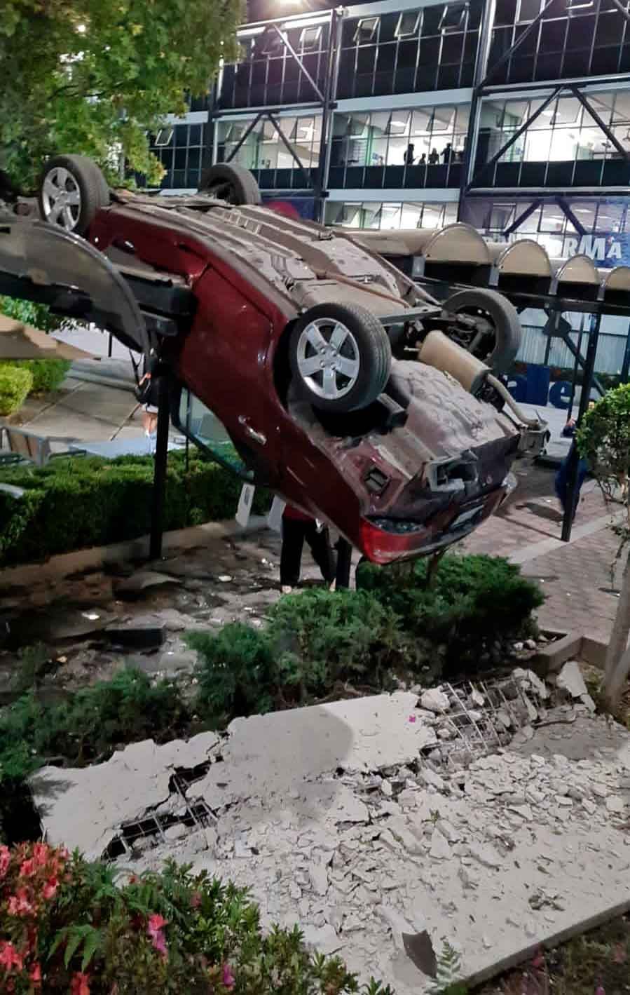 Versiones señalan que el automóvil sedan habría sido golpeado por otro, lo que provocó que fracturara el muro del estacionamiento y cayera hacia una zona peatonal del plantel educativo.