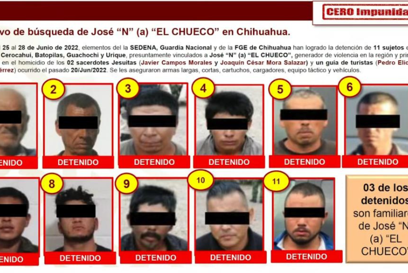 La Secretaría de Seguridad y Protección Ciudadana (SSPC) anunció la detención de 11 personas vinculadas a la célula criminal de José “N”, mejor conocido como El Chueco, presunto asesino de los sacerdotes jesuitas Javier Campos y Joaquín César Mora, además del guía turístico Pedro Palma, en Cerocahui, en el estado de Chihuahua.