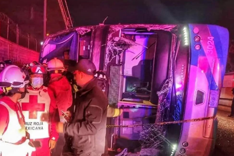 Dos personas murieron y al menos 20 resultaron lesionadas por la volcadura de un autobús de pasajeros en la vía lateral del Paseo Tollocan, en Toluca, Estado de México.