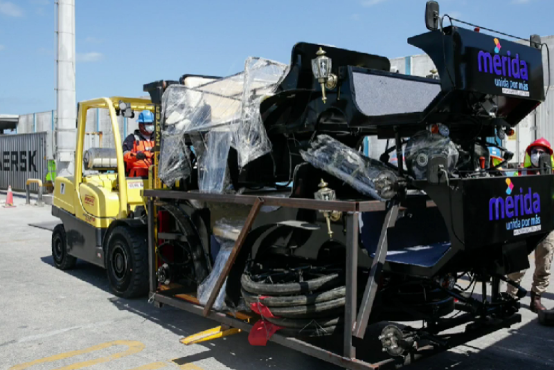 Durante la transmisión en vivo, el alcalde mostró una fotografía del desembarque de las nuevas calesas, la cuales arribaron al Puerto de Progreso, en donde están el proceso de desembalaje procedentes de China.