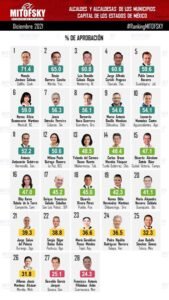 Los estudios son realizados a mexicanos mayores de 18 años y recopilan las aprobaciones de los presidentes municipales de las capitales y las principales ciudades del país, de todos los gobernados y del presidente cada mes.